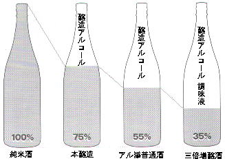 | 2) | 純米酒に一定量(仕込総米の重量の10%以下)までの醸造アルコール(サトウキビかすやタロイモなどを発酵蒸留させたエチルアルコール)を加えて造った「本醸造酒」 | |||